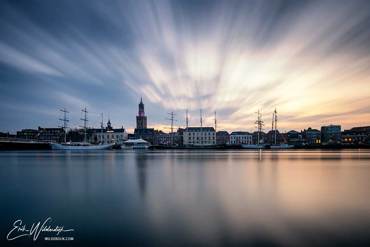 Ik mag ook graag foto’s van Kampen maken waarbij ik een 10-stops grijsfilter gebruik. Dit filter werkt als een zonnebril en laat tien keer minder licht door. Hierdoor is het mogelijk om langere sluitertijden te gebruiken wat een mooi effect in de wolkenlucht teweeg brengt en het water van rivier de IJssel op de foto mooi glad wordt en een zijde glans krijgt.