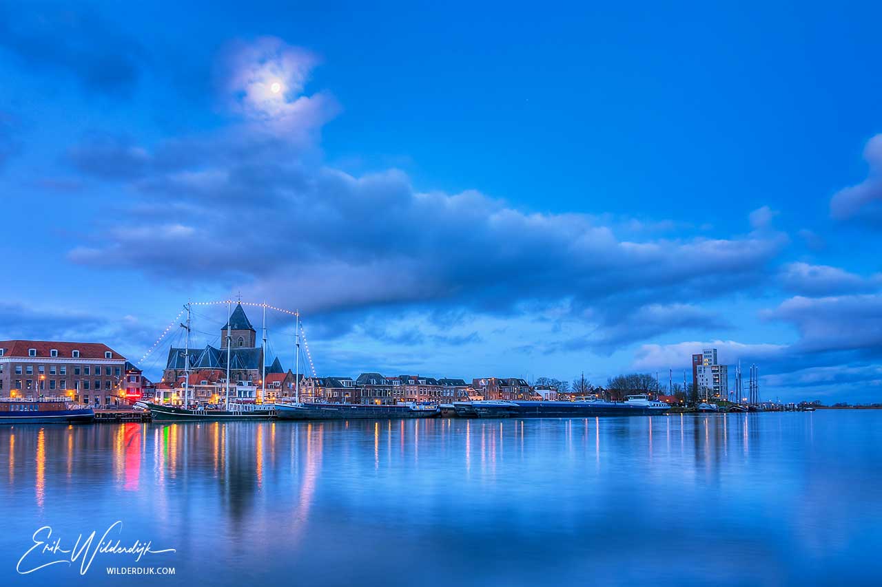 Het IJsselfront van Kampen met wat lage bewolking en de maan boven de Buitenkerk in het blauwe uur