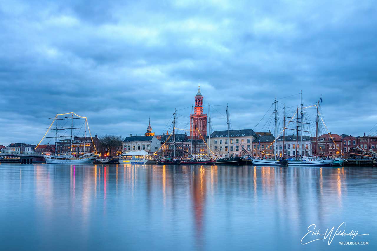 Het blauwe uur, direct na zonsondergang, levert vaak mooie beelden op en dat is bij het stadsfront van Kampen niet anders.